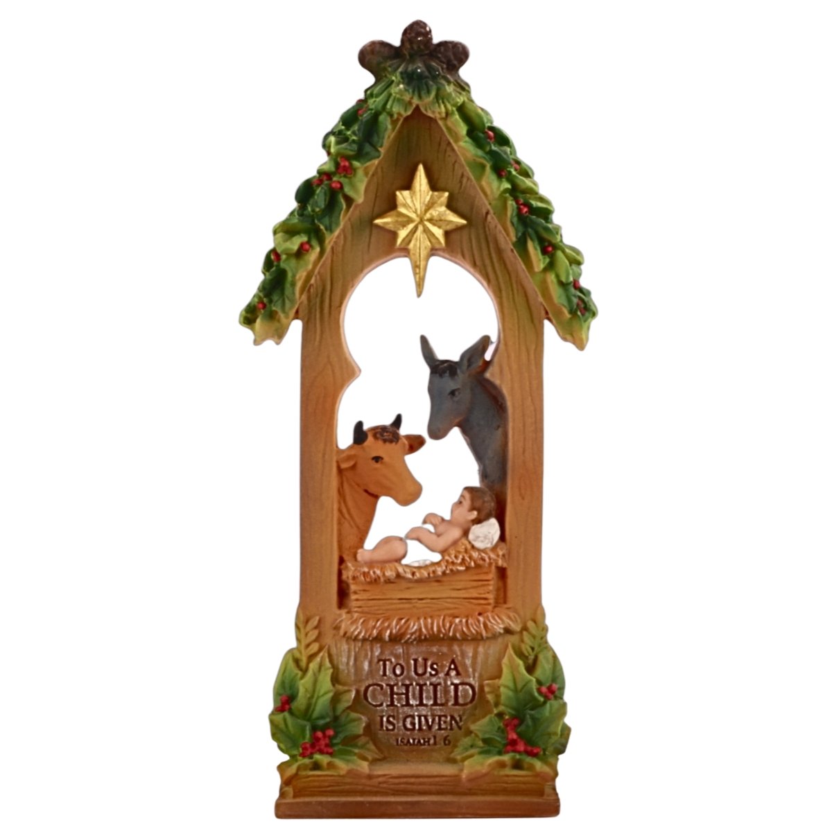 CRIB with Cow and Donkey – 7.5″ Table Top is a finely crafted Christian religious article made of premium polyresin. Designed with care and hand-painted for a unique touch, this table top blends devotion and artistry. Suitable for churches, home altars, religious gift stores, or resellers looking for authentic and inspirational decor. Every piece reflects spiritual significance and craftsmanship. Customizable for bulk orders.